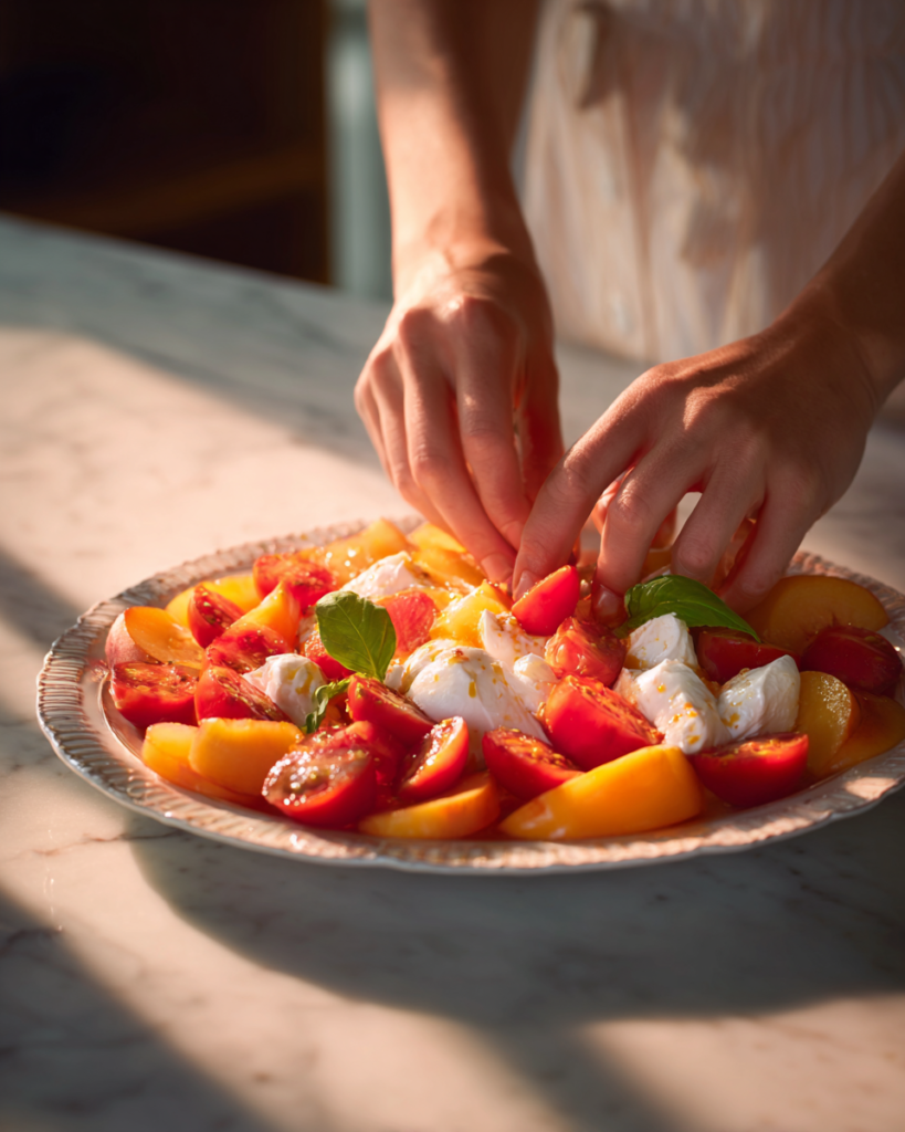 - Presentation Matters: Use a wide, shallow plate to showcase the colorful layers of peaches, tomatoes, and cheese.