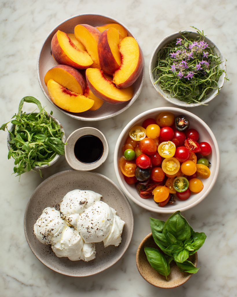 The beauty of this salad lies not only in its taste but in the experience it provides. The vibrant colors of the peaches, tomatoes, and basil instantly make a table more inviting. The creamy richness of the burrata contrasts perfectly with the juicy sweetness of the fruit, while the balsamic glaze adds a subtle tang that ties everything together. It’s a dish that encourages you to slow down, savor each bite, and enjoy the artistry of fresh ingredients.