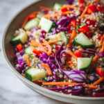This Fresh Quinoa and Red Cabbage Salad Crunchy Healthy Bowl is proof that healthy eating can be simple, vibrant, and deeply satisfying. Every bite delivers a perfect balance of flavors and textures: nutty quinoa, crisp cabbage, sweet carrots, fresh cucumber, and a tangy citrus dressing. It is nourishing without being heavy, making it a versatile option for lunch, dinner, or even as a meal-prep staple.