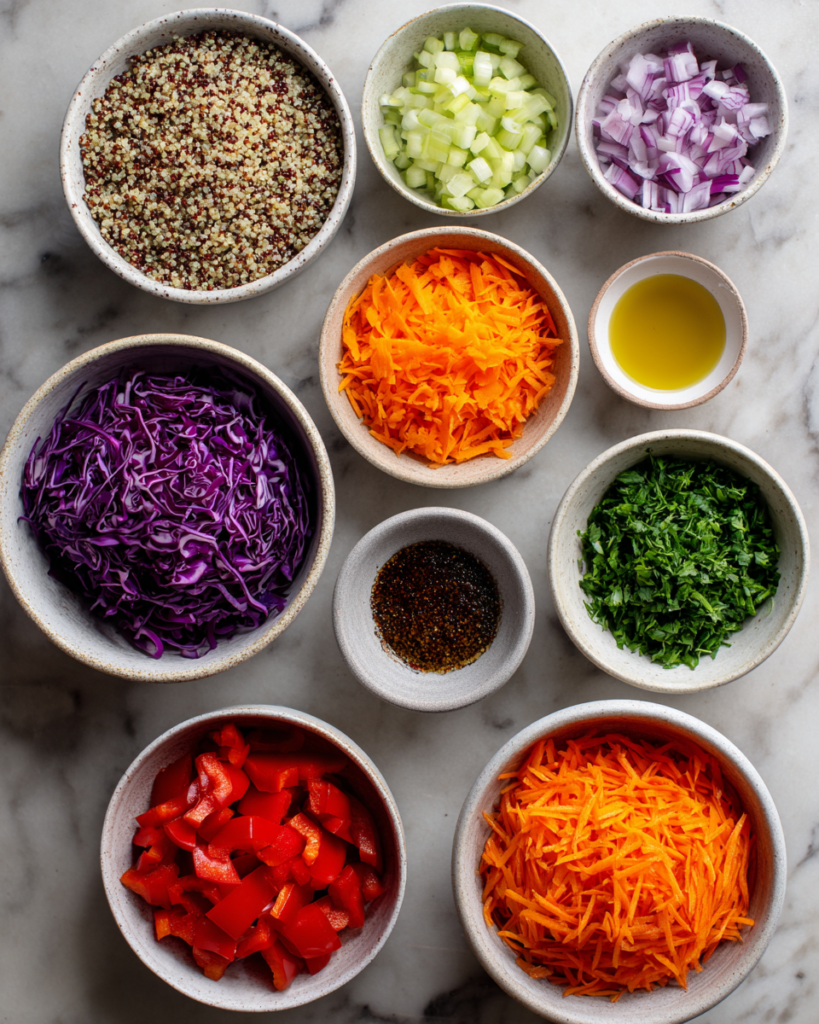 Each of these ingredients brings something unique to the bowl. Quinoa offers a nutty, chewy base, while red cabbage provides a crisp, slightly peppery taste. Carrots add sweetness, cucumber adds freshness, and red bell pepper introduces mild sweetness and color. Fresh parsley and green onions contribute aromatic notes, while the dressing balances acidity, sweetness, and depth.